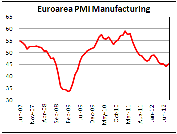 По данным Markit Economics, снижение деловой активности в производственном секторе Еврозоны продолжилось в августе, однако темпы падения замедлились по сравнению с июлем.