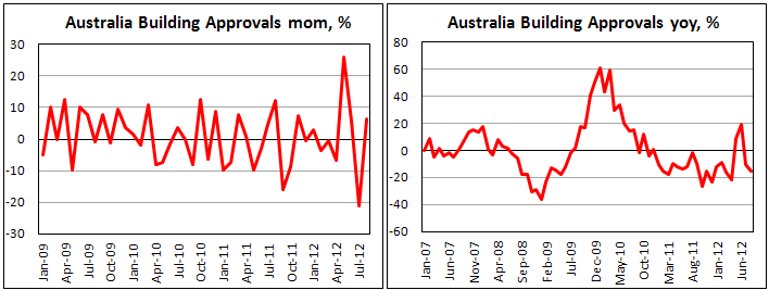 Объем выданных разрешений на строительство увеличился за август 2012 г. на 6,4%, сообщает Австралийское управление статистики. В предыдущем месяце индекс снизился на 21,2%.