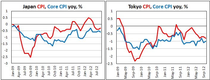 Годовой индекс потребительских цен Японии составил -0,3% за сентябрь 2012 г. по сравнению с -0,4% в предыдущем месяце, сообщает Управление статистики.