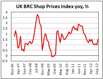 Индекс розничных цен, рассчитанный Британским розничным консорциумом (BRC), вырос на 1,5% в октябре 2012 г. в годовом исчислении по сравнению с увеличением на 1,0% месяцем ранее.