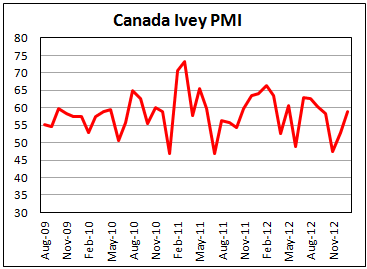 Индекс PMI от Ivey (Ivey Purchasing Managers Index) c поправкой на сезонность составил 58,9 пункта в январе по сравнению с 52,8 пункта месяцем ранее.