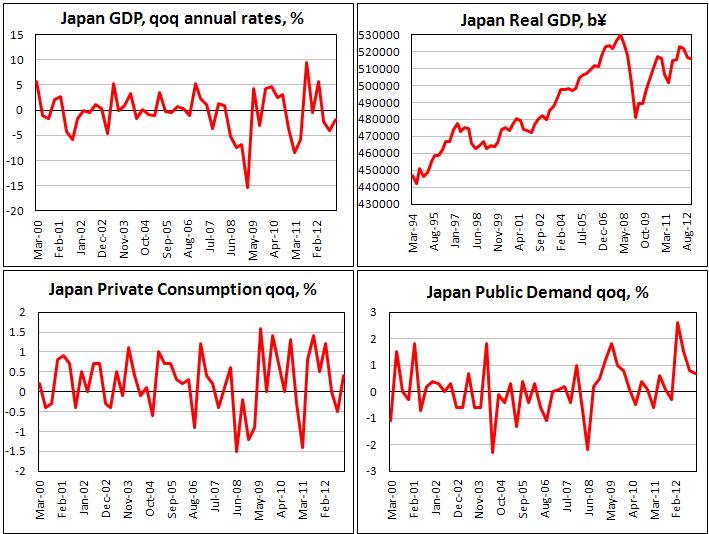 По предварительным данным, ВВП Японии снизился на 0,1% в последнем квартале 2012 года.