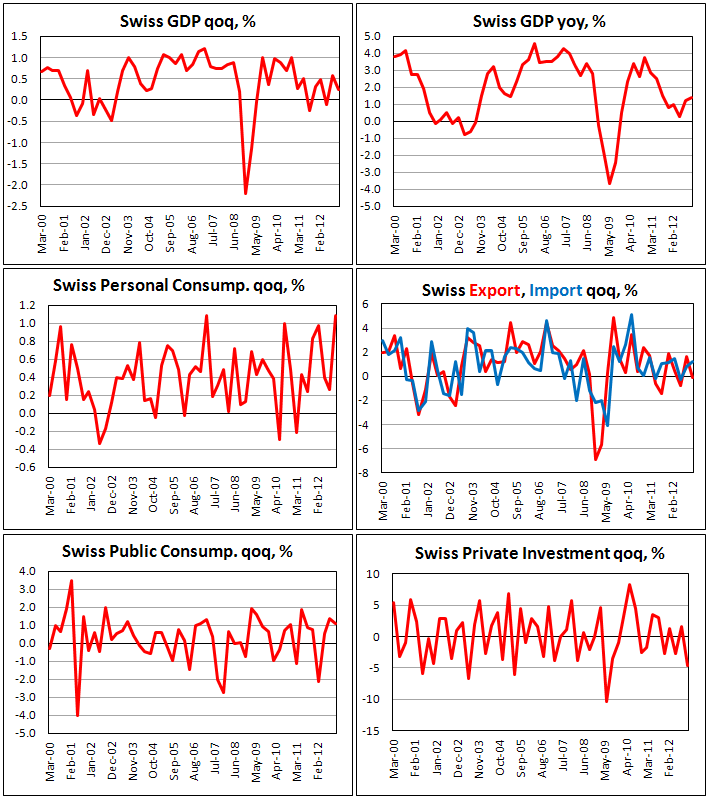 ВВП Швейцарии вырос на 0,2% за четвертый квартал 2012 г., сообщает Государственный секретариат по экономическим делам. Аналитики прогнозировали, что показатель не изменится.