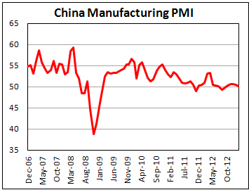 По окончательной оценке, индекс PMI для производственной сферы Китая составил 50,1 пункта за февраль 2013 г. по сравнению с 50,4 пункта месяцем ранее. Отметим, что показатель снижается второй месяц подряд.
