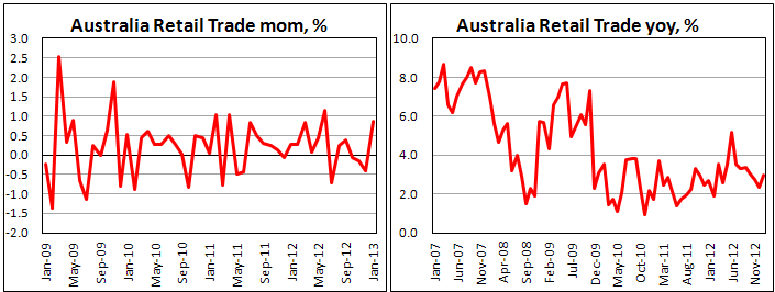 Объем розничной торговли в Австралии с учетом сезонных факторов увеличился на 0,9% за январь 2013 г. в месячном исчислении, сообщает Статистическое управление. Ожидалось повышение показателя на 0,4%. Месяцем ранее продажи снизились на 0,4%.