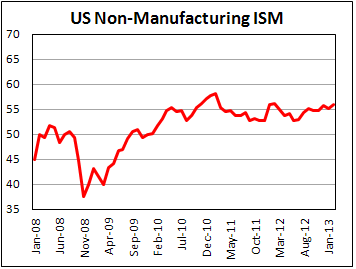 Индекс PMI для непроизводственного сектора повысился до отметки 56,0 в феврале по сравнению с 55,2 в январе.