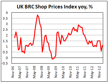 Индекс розничных цен, рассчитанный Британским розничным консорциумом (BRC), вырос на 1,1% в феврале 2013 г. в годовом исчислении по сравнению с увеличением на 0,6% месяцем ранее.