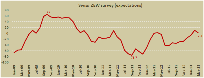 Индекс ожиданий швейцарских инвесторов по данным Центра европейских экономических исследований ZEW и Credit Suisse составил 2,3 пункта за март по сравнению с 10,0 пункта в предыдущем месяце.