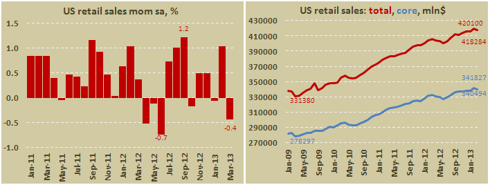 По данным Министерства торговли США, объемы розничных продаж сократились на 0,4% в марте. Показатель без учета продаж автомобилей также снизился на 0,4%.