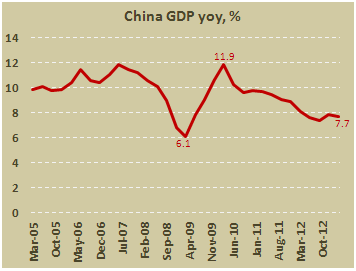ВВП Китая увеличился в годовом выражении на 7,7% в первом квартале по сравнению с ростом на 7,9% в четвертом квартале 2012 года.