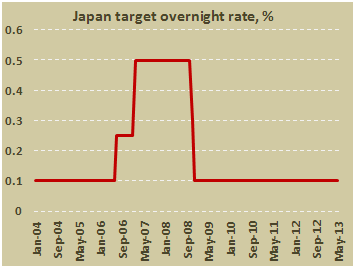 На очередном заседании, состоявшемся 22 мая 2013 г., Комитет по кредитно-денежной политике Центрального Банка Японии оставил ключевую ставку на текущем уровне 0 - 0,10%.