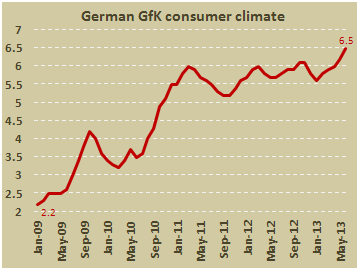 По данным GfK, в июне ожидается повышение потребительского климата в Германии до 6,5 пункта по сравнению с 6,2 пункта в мае. Отметим, что показатель непрерывно растет с января этого года.