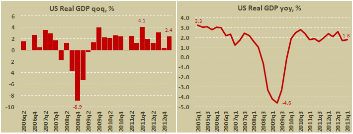 По уточненным данным Бюро экономического анализа, индекс валового внутреннего продукта (ВВП) США вырос на 2,4% за первый квартал 2013 года (пересмотрено с 2,5%).
