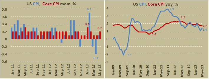 С учетом сезонной поправки индекс потребительских цен (CPI) в США повысился за май 2013 г. на 0,1% в месячном исчислении. В предыдущем месяце цены снизились на 0,4%.