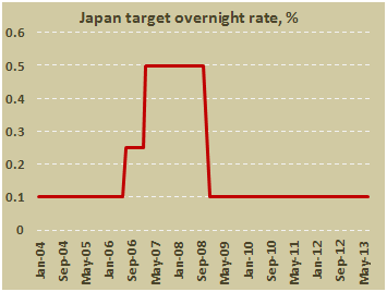 На очередном заседании, состоявшемся 11 июля 2013 г., Комитет по кредитно-денежной политике Центрального Банка Японии оставил ключевую ставку на текущем уровне 0 - 0,10%. Решение было принято единогласно и прогнозировалось большинством аналитиков.