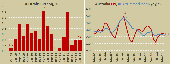 Индекс потребительских цен Австралии увеличился на 0,4% за второй квартал 2013 года при прогнозе повышения на 0,5%. В предыдущем квартале потребительские цены выросли на 0,4%.