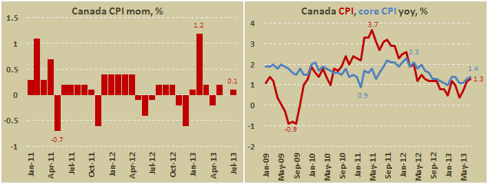Индекс потребительских цен Канады увеличился на 0.1% за июль 2013 г. в месячном исчислении, сообщает Национальное статистическое управление.