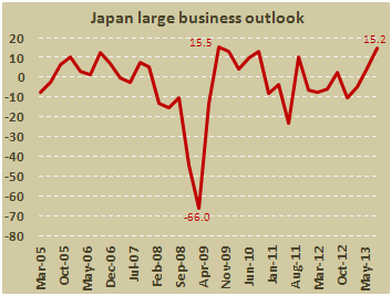Как сообщается в отчете Министерства финансов Японии, индекс деловых условий для крупных производителей повысился до отметки 15,2 в третьем квартале по сравнению с 5,0 в предыдущем квартале.