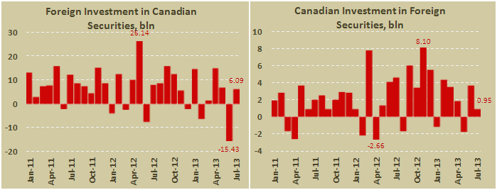 За первые семь месяцев 2013 года приток капитала в Канаду в результате продажи ценных бумаг составил C$21,9 млрд.