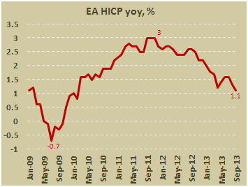 По предварительным данным статистического ведомства Евросоюза Eurostat, индекс потребительских цен еврозоны составил 1,1% за сентябрь 2013 г. в годовом исчислении. Ожидалось, что показатель останется на прежнем уровне 1,3%.