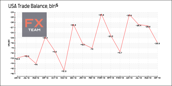 По данным Бюро переписи и Бюро экономического анализа дефицит торгового баланса США составил $41,8 млрд. за сентябрь 2013 г. по сравнению с дефицитом $38,7 млрд. в предыдущем месяце. Аналитики прогнозировали отрицательное сальдо на уровне $38,7 млрд.