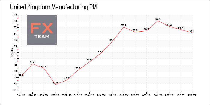 По данным исследовательской группы Markit, индекс PMI для производственного сектора Великобритании возрос до отметки 56,9 в феврале по сравнению с 56,7 в январе.