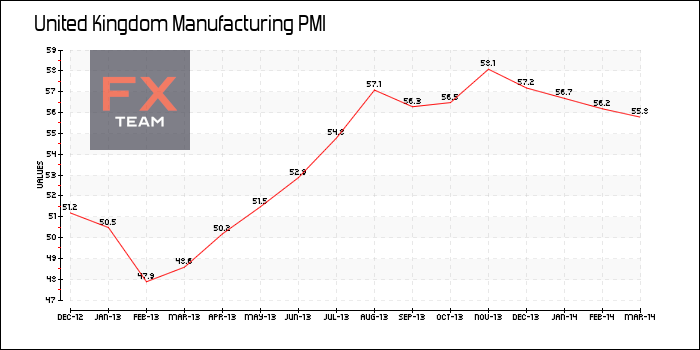 Индекс PMI, отражающий динамику деловой активности, экономические условия и перспективы развития производственного сектора Великобритании, с учетом сезонных колебаний составил 55.3 пункта в марте 2014 г. по сравнению с 56,2 пункта в предыдущем месяце. Ожидалось повышение показателя до 56,7 пункта.
