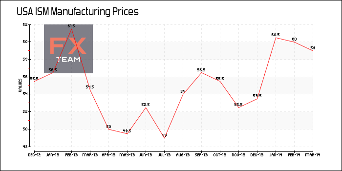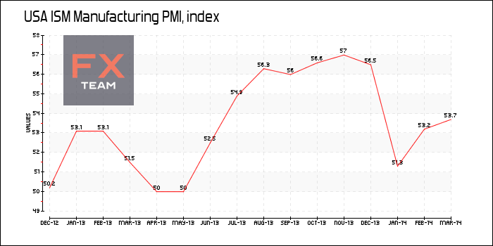 Производственный индекс ISM США составил 53,7 пункта за март 2014 г. по сравнению с 53,2 пункта в предыдущем месяце. Прогнозировалось повышение показателя до 54,2 пункта.