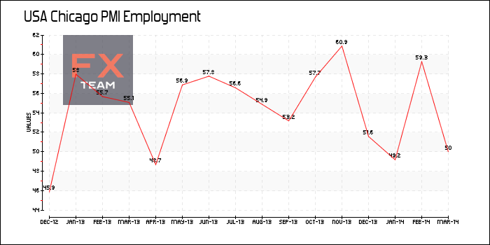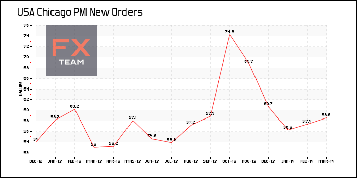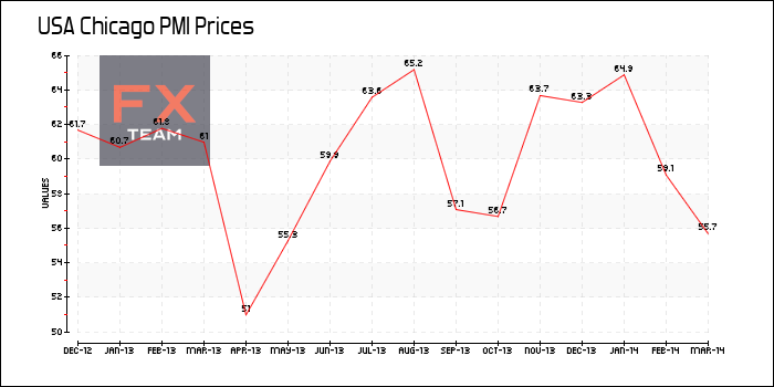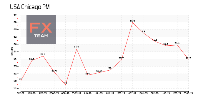 Индекс деловой активности в районе Чикаго составил 55,9 пункта за март 2014 г. по сравнению с 59,8 пункта в феврале, сообщает the Institute for Supply Management's Chicago. Индекс оказался хуже ожиданий на уровне 59,2 пункта. Кроме того, это самое низкое значение показателя с августа прошлого года.