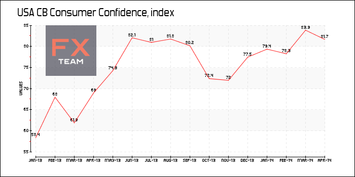 Индикатор потребительской уверенности (CB Consumer Confidence) составил 82,3 пункта за апрель 2014 г. по сравнению с 83,9 пункта в предыдущем месяце. Аналитики прогнозировали снижение показателя до 82,9 пункта.