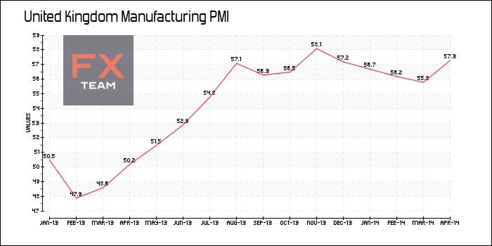По данным исследовательской группы Markit, индекс PMI для производственного сектора Великобритании повысился до 57,3 в апреле по сравнению с 55,8 в марте.