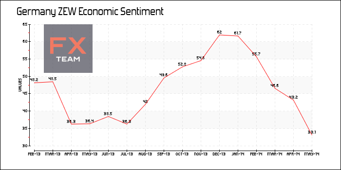 Индекс деловых настроений снизился больше, чем ожидалось до отметки 33.1, наиболее низкого уровня с января 2013 года по сравнению с 43.2 в апреле, сообщил институт ZEW.