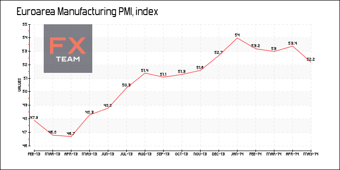 По окончательным данным, индекс менеджеров по снабжению в производственной сфере (PMI manufacturing) еврозоны составил 52,2 пункта за май 2014 г. (пересмотрено с 52,5 пункта). В апреле показатель находился на отметке 53,4 пункта.