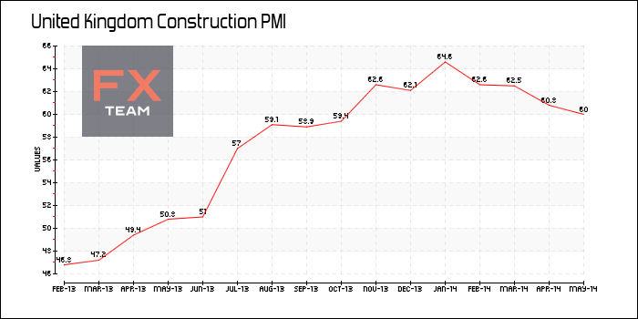 Индекс PMI для строительного сектора Британии составил 60,0 пункта в мае 2014 г. по сравнению с уровнем 60,8 в апреле, указывая на стабилизацию деловой активности и оптимизма. Аналитики прогнозировали повышение индекса до отметки 61,2 пункта.