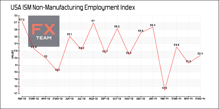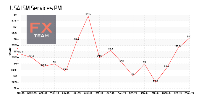 Композитный индекс ISM для непроизводственной сферы США составил 56,3 пункта в мае 2014 г. по сравнению с 55,2 пункта в предыдущем месяце. Ожидалось повышение показателя до отметки 55,6 пункта.