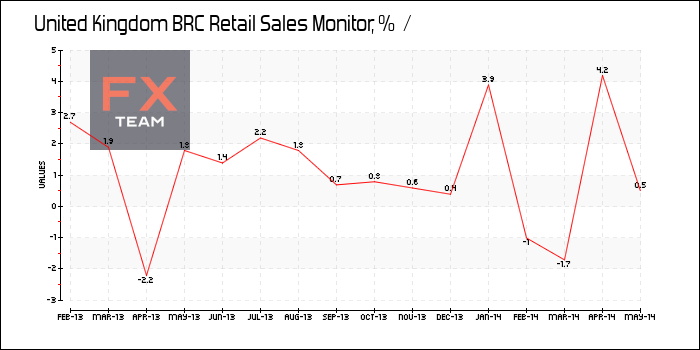Розничные продажи в Британии увеличились на 0,5% за май 2014 г. в годовом исчислении, как показывает монитор розничных продаж Британского розничного консорциума (BRC Retail Sales Monitor).