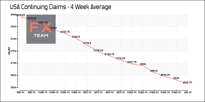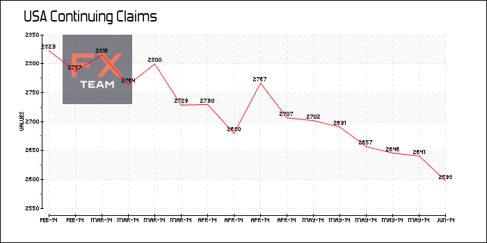 Число повторных заявок на получение пособия по безработице снизилось за неделю к 7 июня с 2615К до 2561К при прогнозе 2600К.