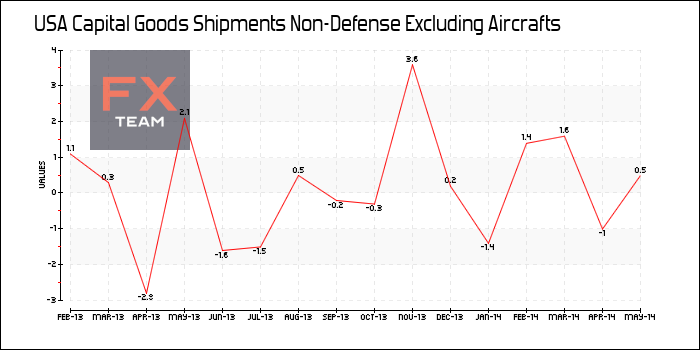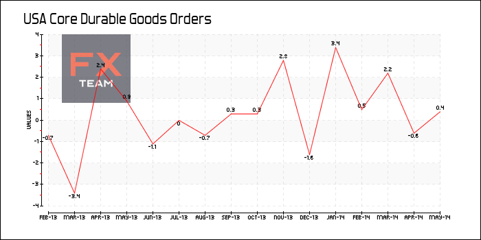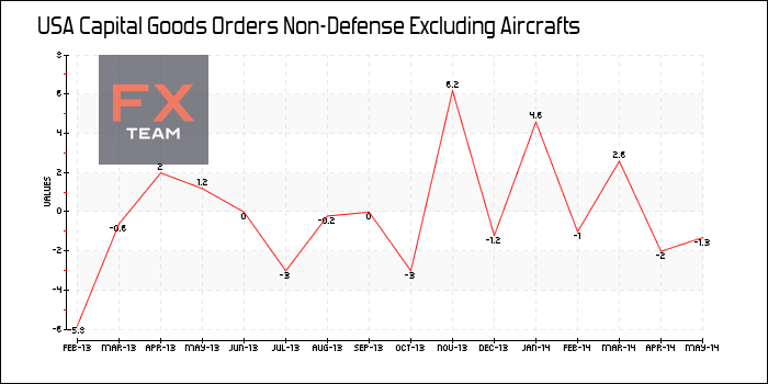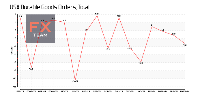 Объем заказов на товары длительного пользования (Durable goods orders) в США сократился на 1,0% за май 2014 г. в месячном исчислении. Ожидалось снижение индекса на 0,1%. В предыдущем месяце объем заказов увеличился на 0,8%.