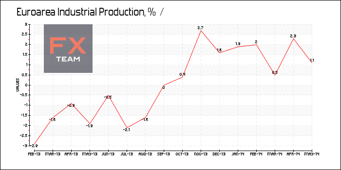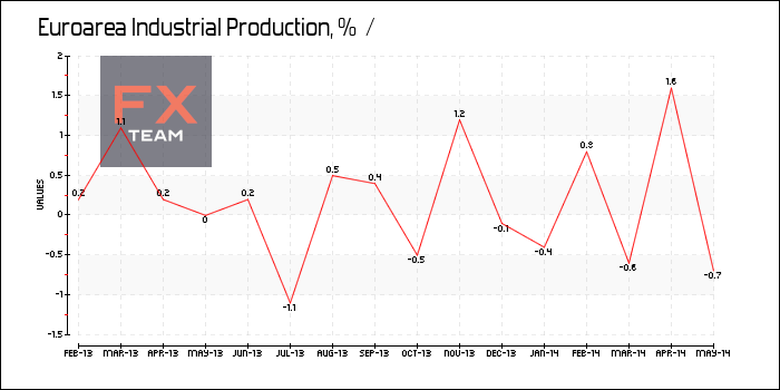 Промышленное производство снизилось на 1.1% в месячном исчислении в мае, это наибольшее падение с сентября 2012 года. В апреле рост показателя составил 0.7%, сообщил Eurostat. Это было второе снижение в этом году. Аналитики ожидали, что показатель снизится на 1.2%.