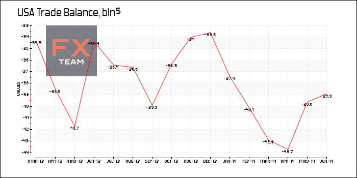 По данным Бюро переписи и Бюро экономического анализа дефицит торгового баланса США составил 41,54 млрд. долларов за июнь 2014 г. по сравнению с дефицитом в размере 44,66 млрд. долларов в предыдущем месяце. Ожидалось, что дефицит составит приблизительно 44,2 млрд. долларов.