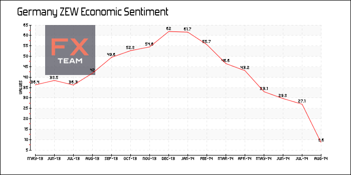 Индикатор экономического доверия снизился на 18.5 пунктов до отметки 8.6 в августе, вследствие геополитической напряженности. Это наименьшее значение с декабря 2012, когда показатель оказался на уровне 6.9. Ожидаемое значение для августа было на уровне 17.
