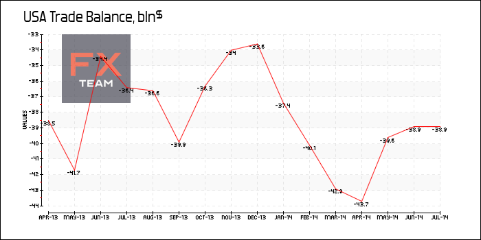 По данным Бюро переписи и Бюро экономического анализа, дефицит торгового баланса США достиг шестимесячного минимума в июле 2014 года.