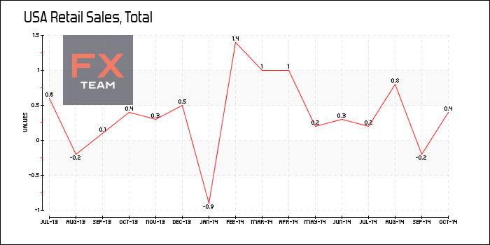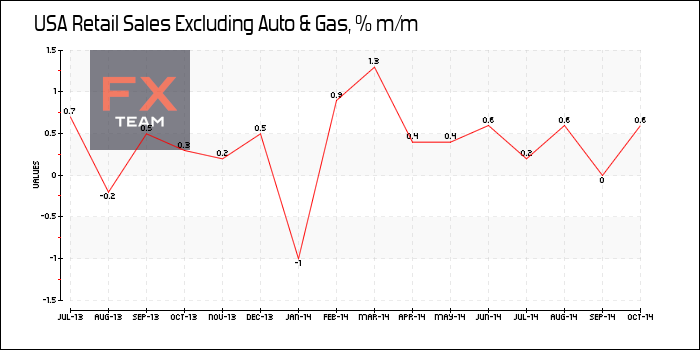 Розничные продажи без учета продаж бензина повысились на 0,5% в октябре. При этом продажи бензина упали на 1,5% в связи со снижением мировых цен на нефть.