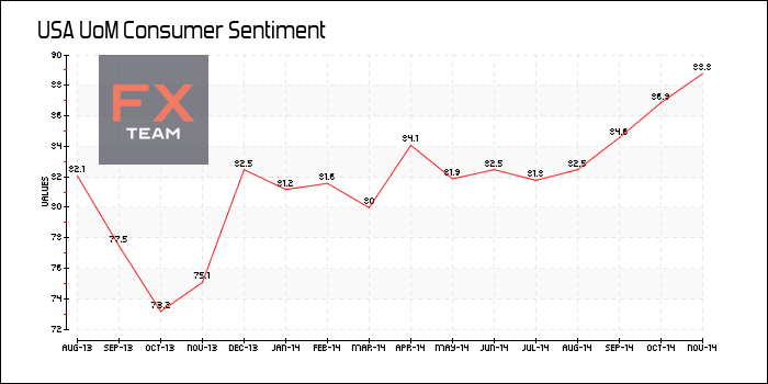 По предварительным данным Университета Мичигана совместно с Thomson Reuters, индекс настроений потребителей в США возрос до отметки 89,4 в ноябре по сравнению с 86,9 в октябре.