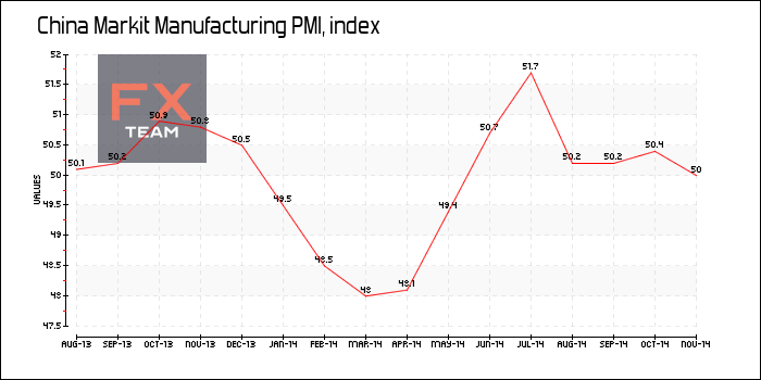 По предварительным данным HSBC/Markit, индекс PMI для производственного сектора Китая снизился до отметки 50,0 в ноябре по сравнению с 50,4 в октябре.