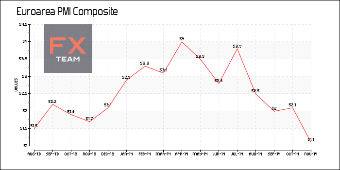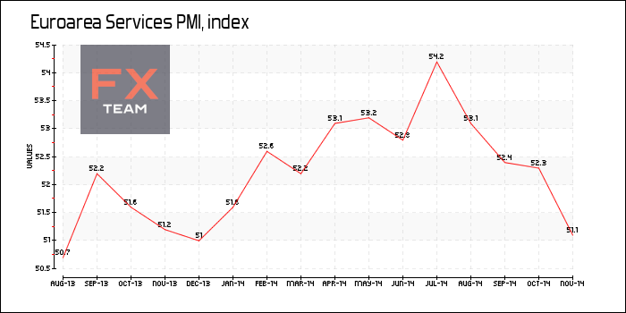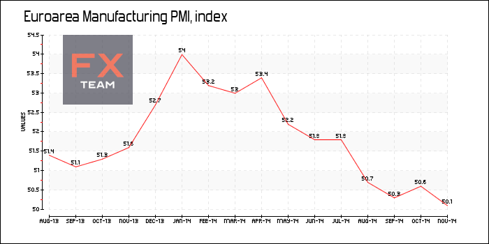 По предварительным данным Markit Economics, индекс деловой активности в производственном секторе (PMI manufacturing) еврозоны составил 50,4 пункта за ноябрь 2014 г. по сравнению с 50,6 пункта в октябре. Ожидалось повышение показателя до 50,9 пункта.