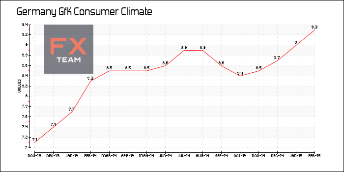 По данным GfK, опережающий индекс потребительского климата Германии составил 9,3 пункта на февраль 2015 года по сравнению с предыдущим значением 9,0 пункта. Это максимальный уровень показателя с ноября 2001 года, когда индекс потребительского климата составил 9,6 пункта.