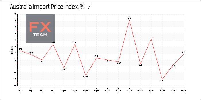 Индекс импортных цен Австралии увеличился на 0,9% за четвертый квартал 2014 г., сообщает Австралийское управление статистики. Ожидалось увеличение показателя на 1,5% после снижения на 0,8% в предыдущем квартале.