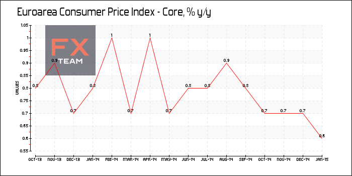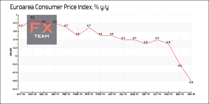 По предварительным данным статистического ведомства Евросоюза Eurostat, годовой индекс потребительских цен еврозоны упал на 0,6% за январь 2015 года по сравнению со снижением на 0,2% в декабре прошлого года. Экономисты прогнозировали сокращение показателя на 0,5%.