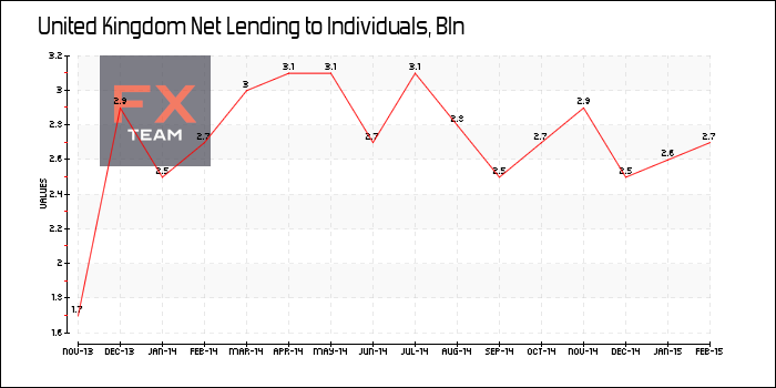 Объем займов частным лицам увеличился на 2,5 млрд. фунтов стерлингов за февраль 2015 г. по сравнению с ростом на 2,4 млрд. фунтов стерлингов в предыдущем месяце и при среднем ежемесячном приросте 2,6 млрд. фунтов за предыдущие шесть месяцев, сообщает Банк Англии. Значение показателя соответствует ожиданиям. Годовой рост составил 2,3%.